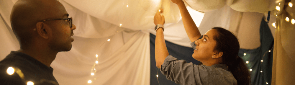 Build a cozy fort with blankets and pillows in your living room. Snuggle inside with popcorn and your favorite films or a series you’ve been meaning to watch together.